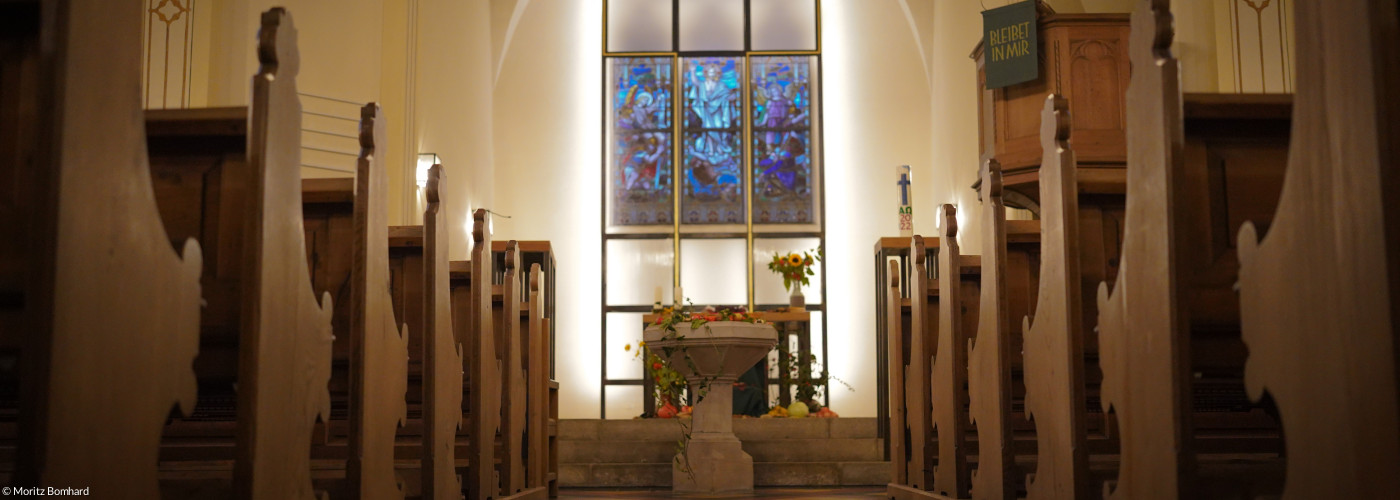 Wie in fast allen evangelischen Kirchen stehen Kanzel und Altar nahe beieinander. Wort und Sakrament sind gleichwertig und ergänzen sich.
